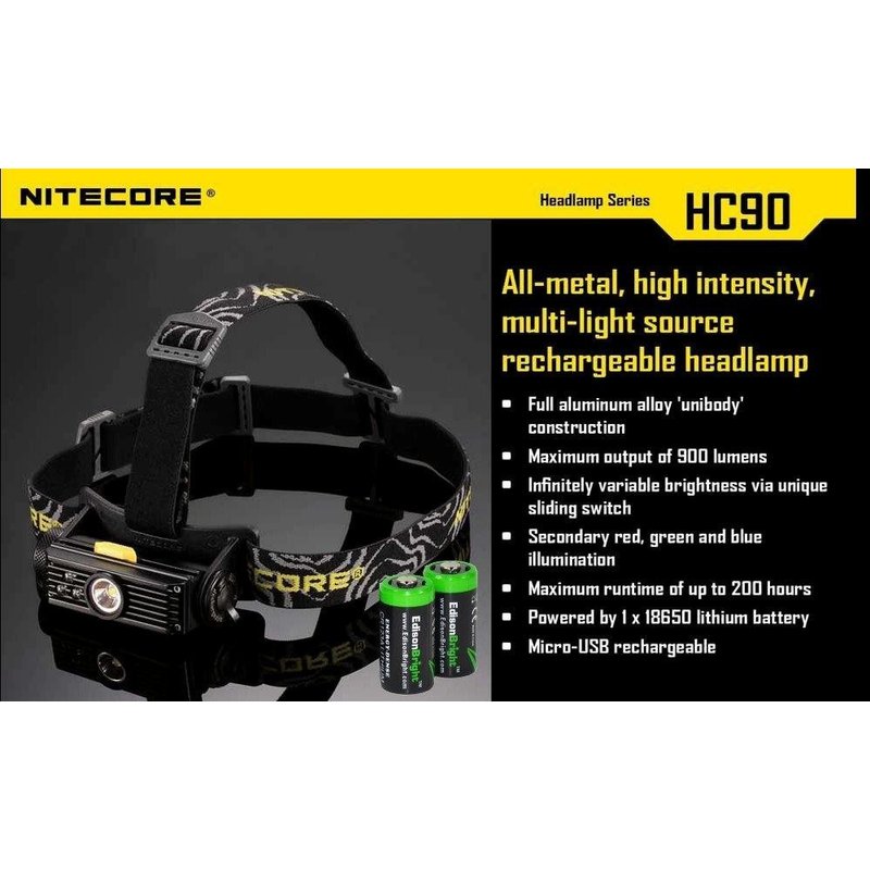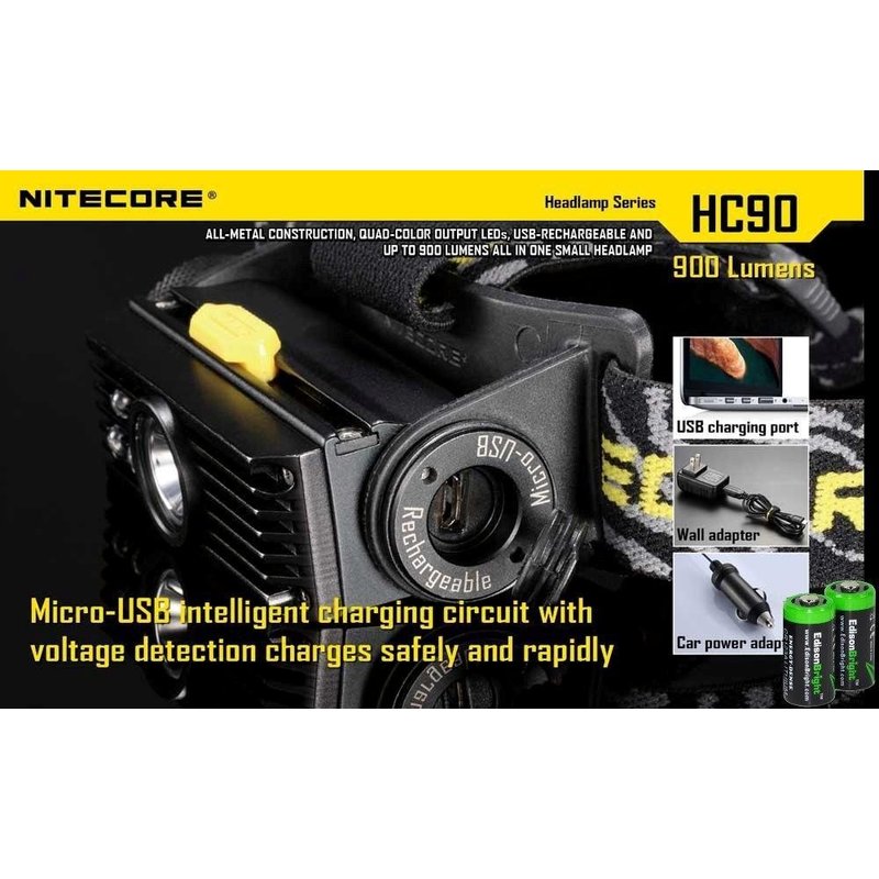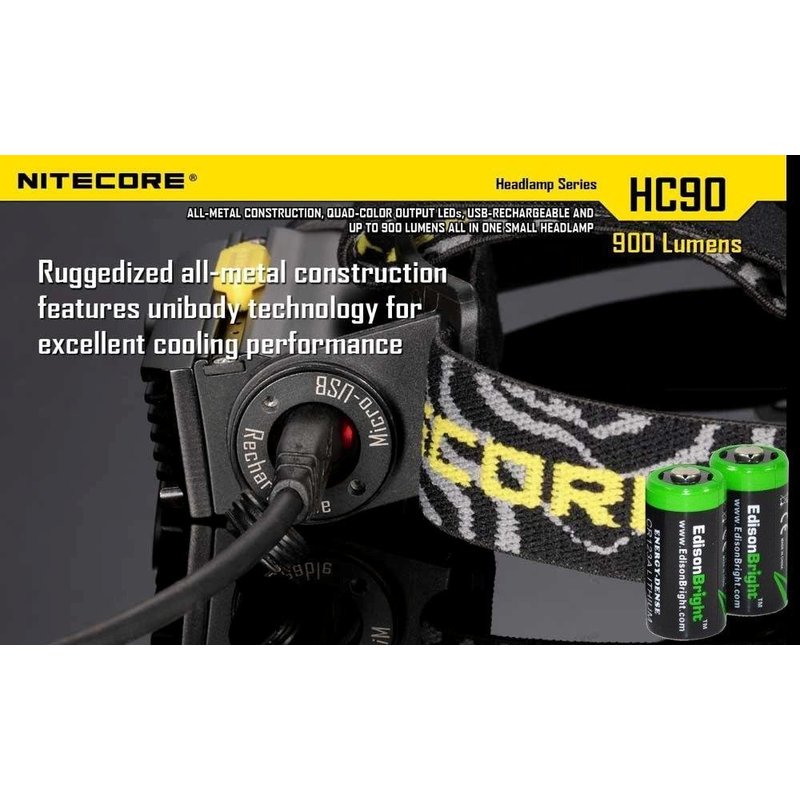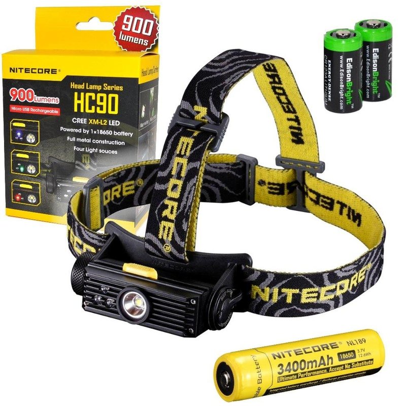 Nitecore HC90 900 Lumen CREE XM-L2 T6 LED USB rechargeable headlamp with Genuine NL189 18650 3400mAh Li-ion rechargeable battery, Two EdisonBright CR123A Lithium Batteries