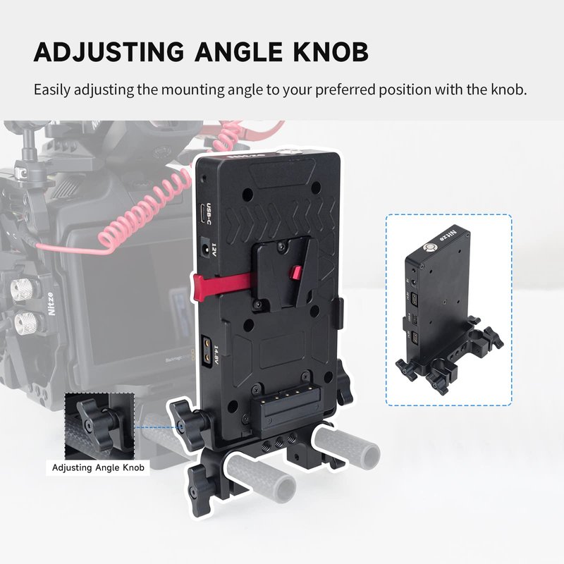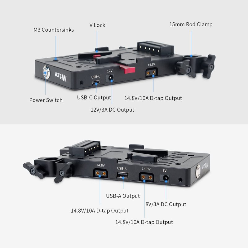 【High Durability】Nitze N21-E v mount battery plate with 15mm rod clamp is made of aluminum alloy which is sturdy and durable. 【Multiple Output Ports】It provides one 12V/3A DC Output, one 8V/3A DC Output, one 14.8V/10A D-tap Output, one USB-A Output (5V/2.1A,9V/2A,12V/1.5A), and one USB-C output (5V/3A,9V/3A,12V/3A,15V/3A,20V/3A). 【Power Switch】The power switch on the top helps you turn the device on/off easily to prevent the battery from draining. 【Flexible Positioning】The mounting angle of the 15mm rod clamp can be conveniently and quickly adjusted by the adjusting angle knob. 【Note】Please pay attention to use the same adapter cable as the v mount plate interface voltage to avoid short circuit.