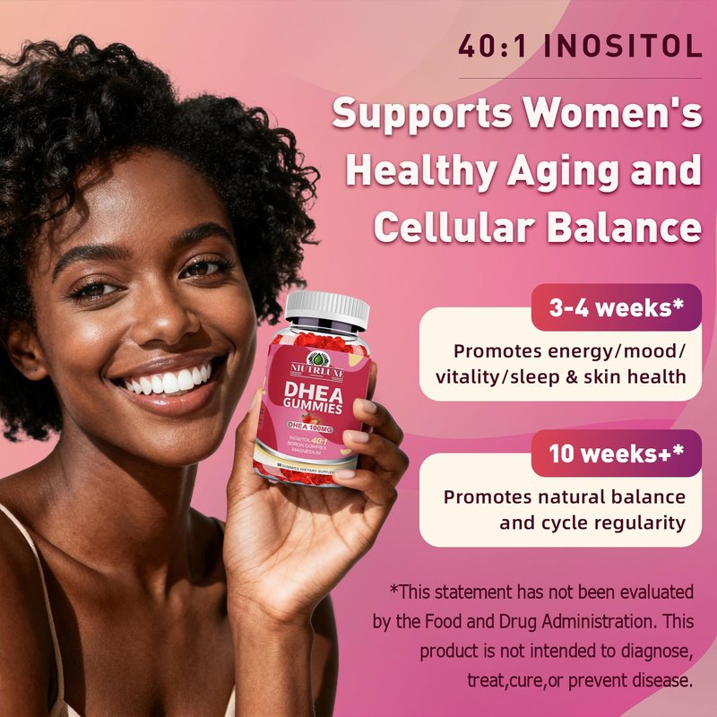 Our DHEA Gummies are specially formulated for women, delivering 50 mg or 100 mg of high-gually dehydroepiandrosterone (DHEA) perserving, enhanced wth boron,inosito, and magnesium. These delicious, easy-to-take gummies support healthy* aging by nourishing hormonal*balance, promoting ovarian support, and aiding restful sleep. Crafted with natral fruit favors and free from artificial colors, gluten, and dairy,each bottle contains 60 tasty gummies for 1-2 months of daily support.