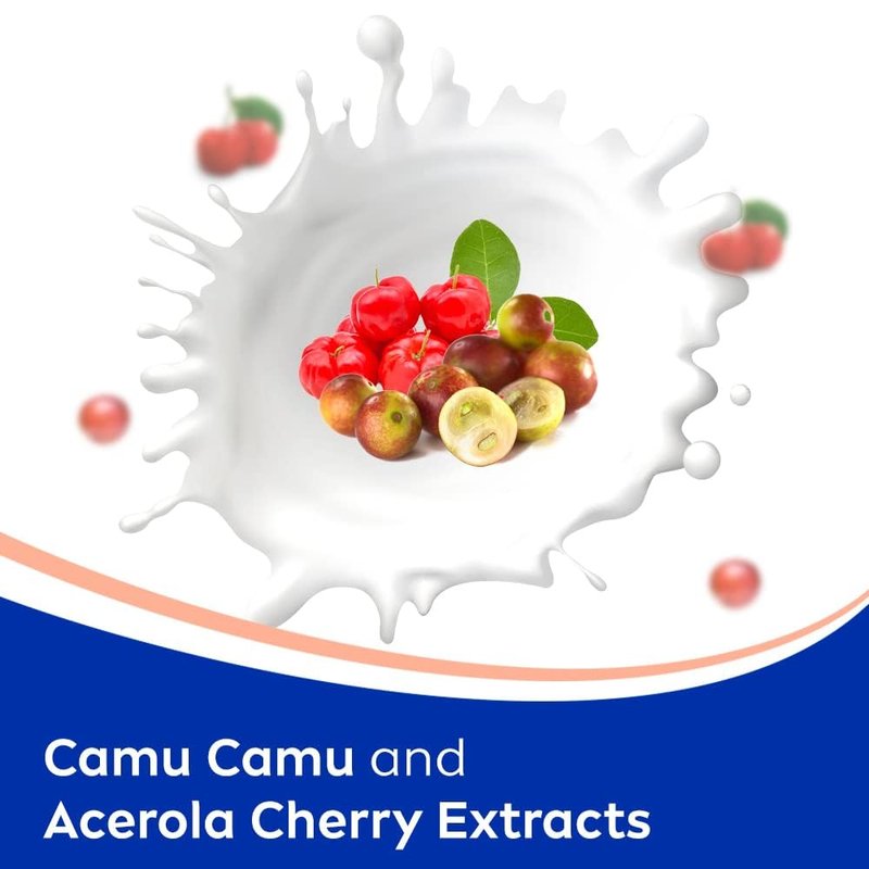 - Concentrated natural super fruit extracts of camu camu and acerola cherry, which offer up to 40 times higher vitamin C
