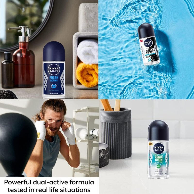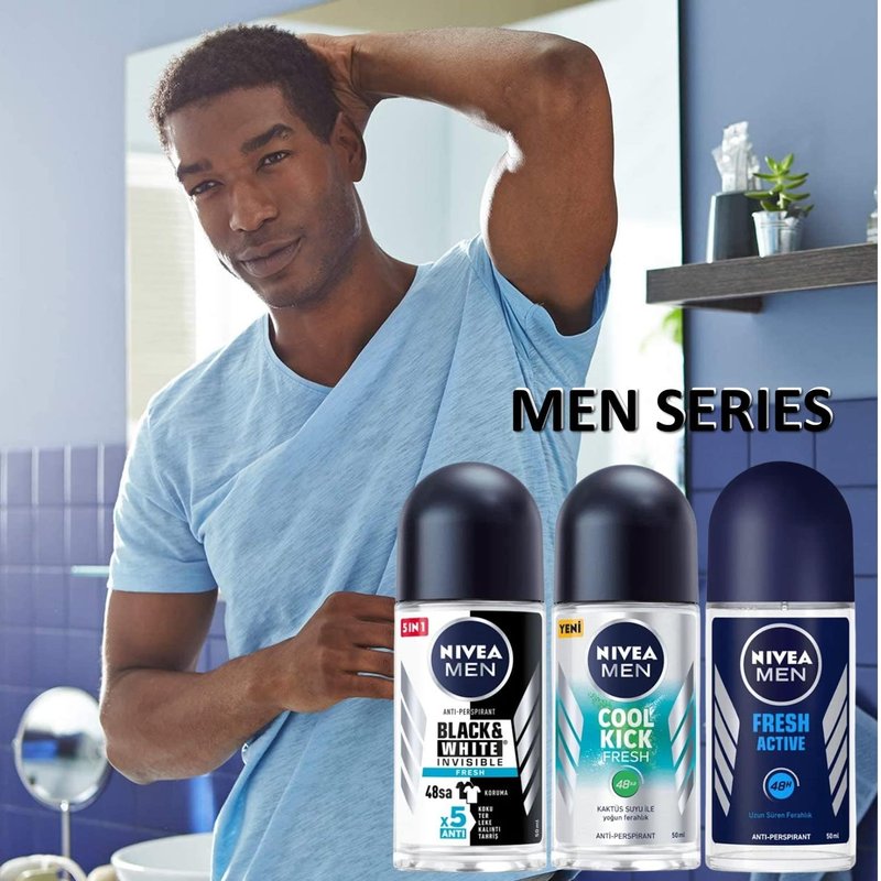 Using Nivea men dodorant black and white fresh, cool kick fresh, fresh active roll on results in beautiful, soft underarms. It’s the perfect combination of Nivea‘s mild care and reliable anti-perspirant protection, all day long.