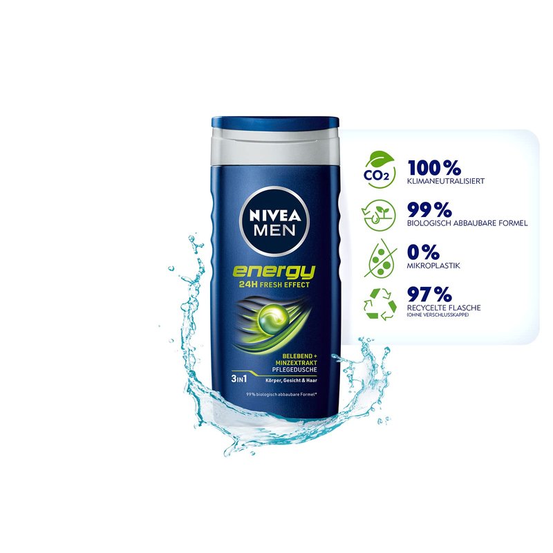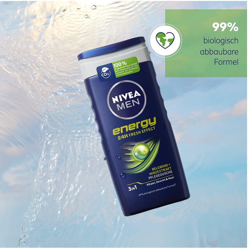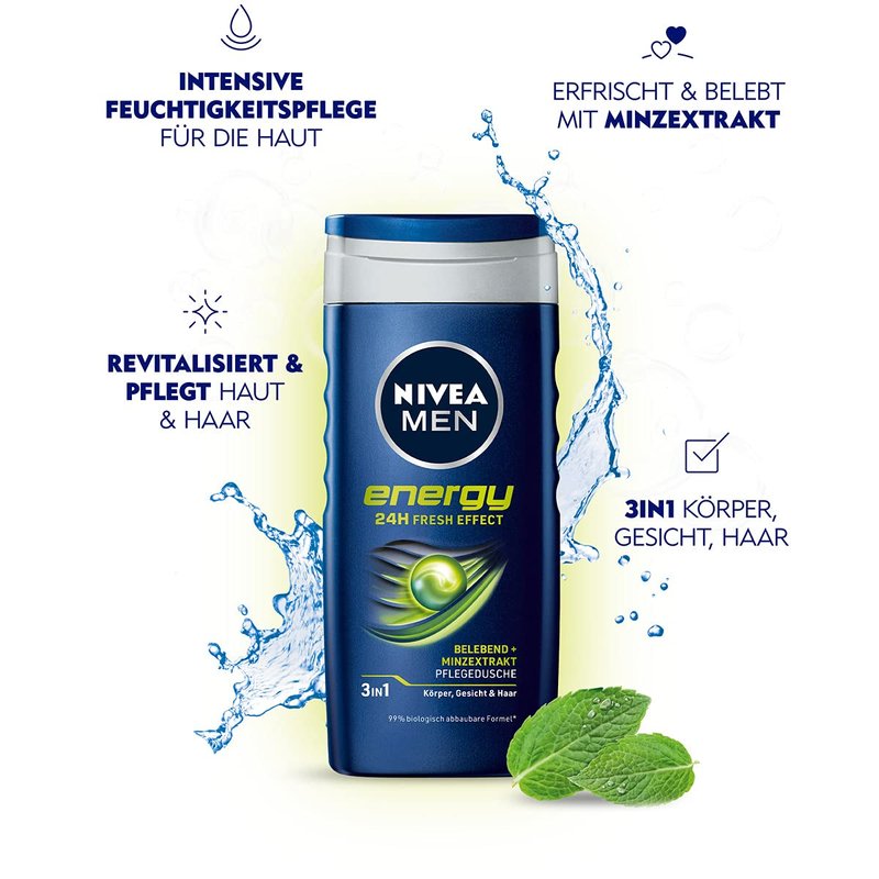- Energy care shower - The Nivea Men Energy shower gel provides refreshment and optimal skin care. It gives energy and the feeling of intensive care.