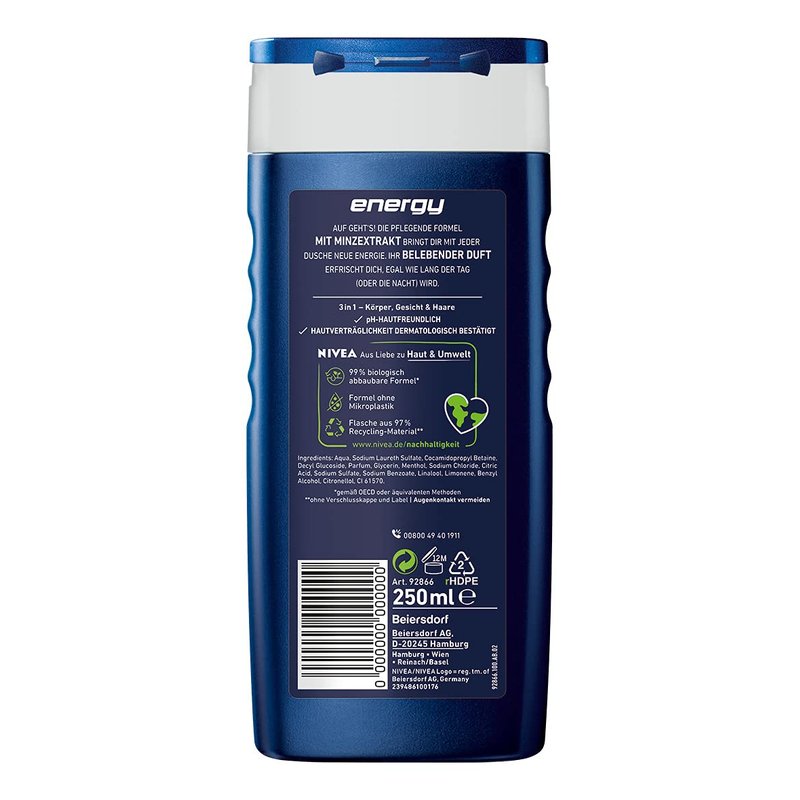 - Box contents & details - Nivea Men Energy Shower 250 ml, invigorating cleansing with refreshing mint extract, item number 92866