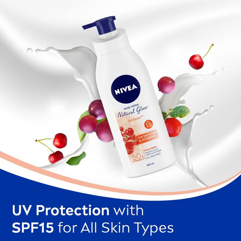 - Nivea Natural Glow Cell Repair Body Lotion, With SPF 15 and 50X Vitamin C, 13.52 Fl Oz, Pack of 1
