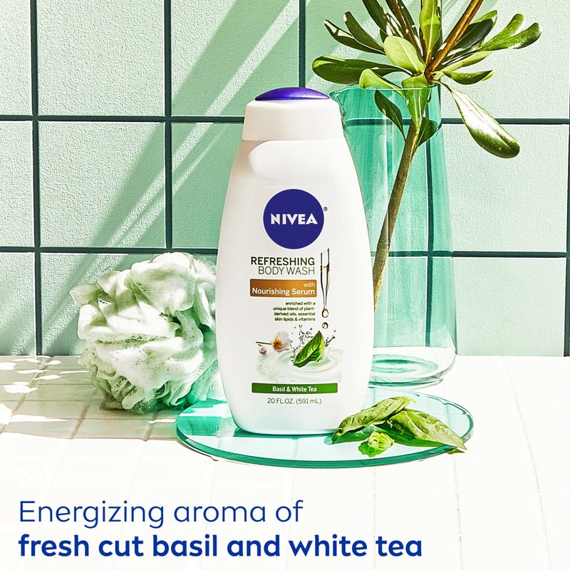 - Includes one (1) 20 fluid ounce bottle of NIVEA Basil and White Tea Body Wash with Nourishing Serum