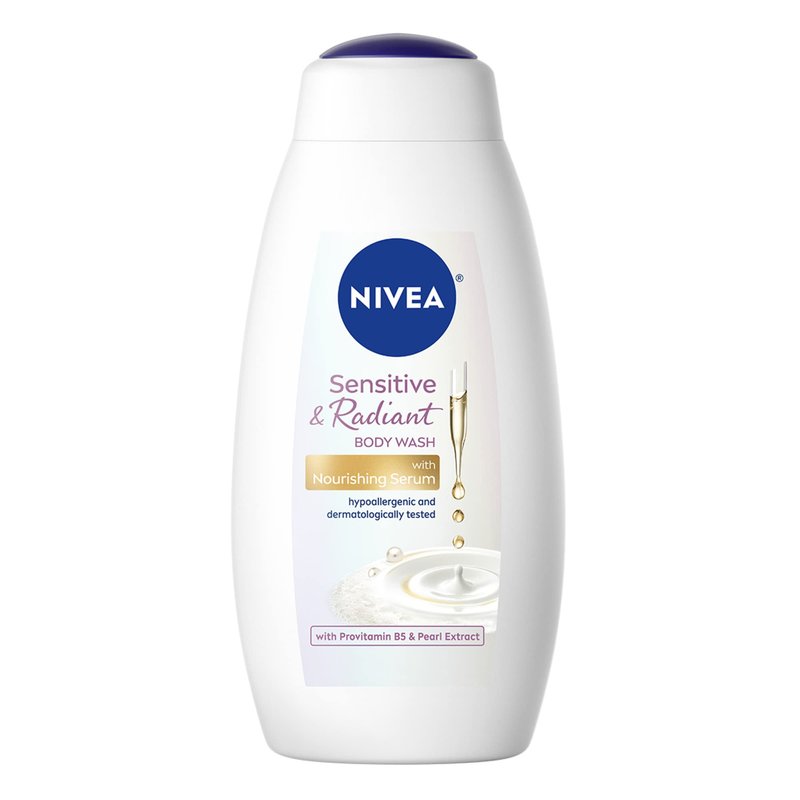 Body wash with nourishing serum. With provitamin b5 & pearl extract. Hypoallergenic & dermatologically tested. Nivea Sensitive & Radiant Body Wash gently cleanses, provides nourishing moisture to sensitive skin feeling completely nourished, radiant and healthy-looking. Our sensitive & radiant promise. Soap, dye, paraben, silicone, synthetic thickeners free. Formulated without phthalates or microplastic particles. Contains plant-derived ingredients. Formula with 99% biodegradable ingredients (Based on OECD or equivalent methods). Nourishing Moisture: The formula enriched with nourishing serum and provitamin B5 provides nourishing moisture for soft, smooth skin. Radiance: Enriched with pearl extract, leaving skin radiant and healthy-looking. Balance: Microbiome gently, pH skin balanced and hypoallergenic formula that respects the skin. Skin compatibility dermatologically tested. www.niveausa.com. We'd love to hear for you! 1-800-227-4703; www.niveausa.com. Made in Mexico.