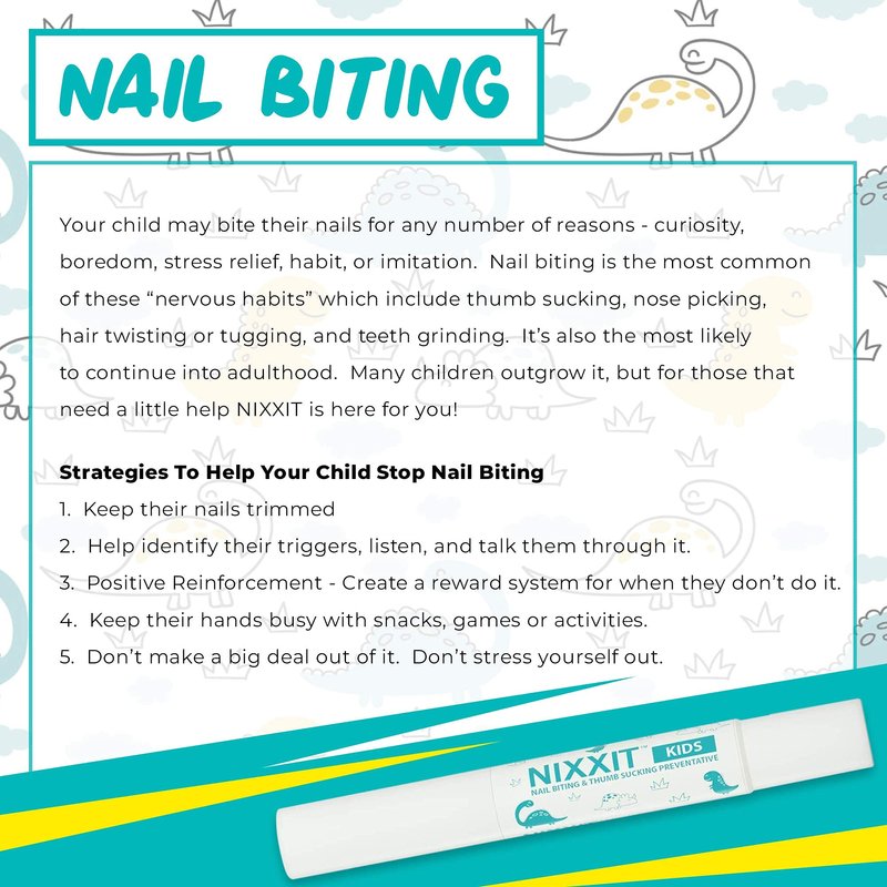 - NAIL BITING TREATMENT FOR KIDS - Does your kid bite their nails & haven't found a solution? NIXXIT Nail Biting Preventative will help break your child’s habit once and for all. As parents’ and former nail biters’ we understand how difficult it can be, after years of research we’ve created the product we wish we had for our kids, our bitter but safe formula will help stop your kids habit.