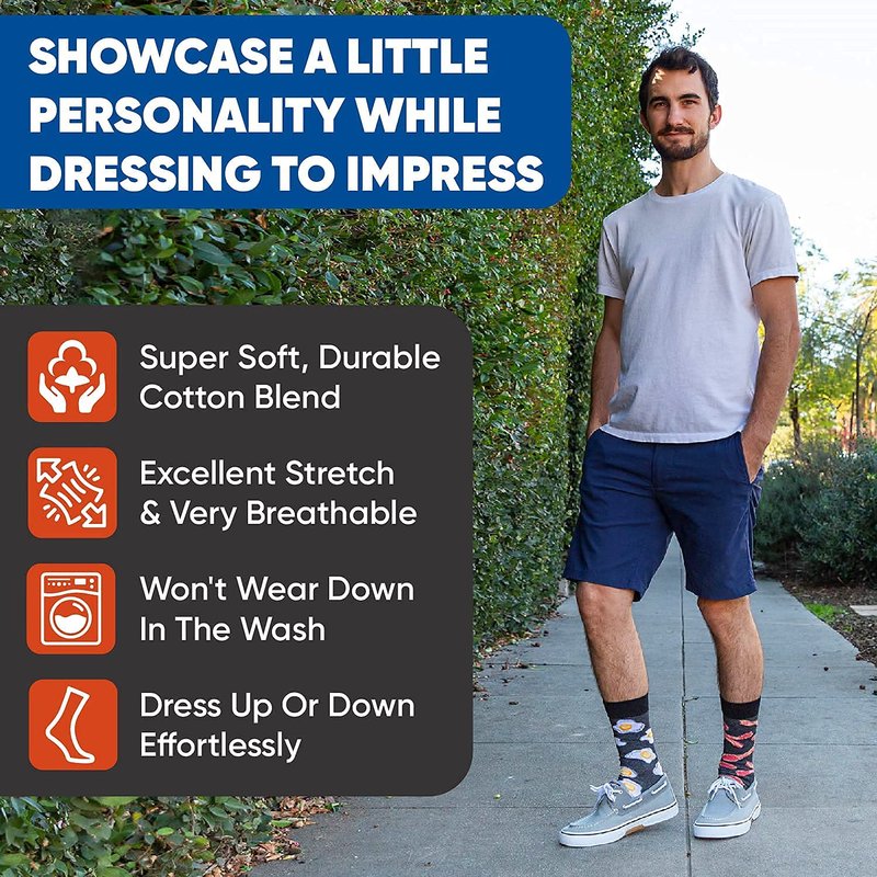 - Gift with Impact: Break the gifting cliché with our mens dress socks fun edition. Make a lasting impression by presenting these quirky socks to men of all ages. Bid farewell to uninspiring gifts – these funky socks cater to those itching to express themselves, making them an ideal gift for the fashionable men in your life.
