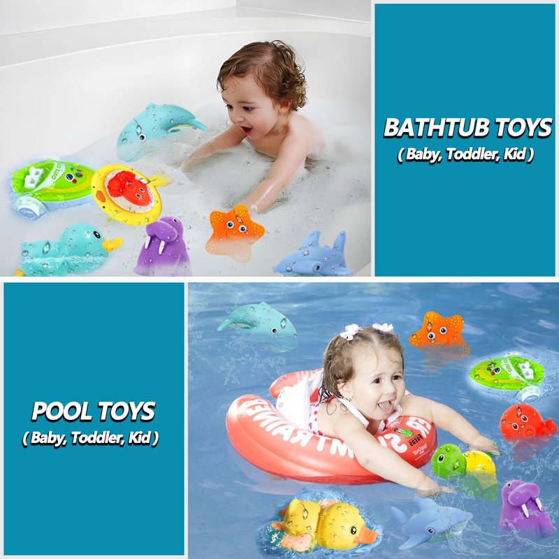 - FUN: Among shower toys, the octopus and starfish will change color auto in 98℉warm water, the wind-up swimming ducks can swim in the water, the amphibious boat can not only swim in the water but also run on the land, catch with fishing net,use the watering can to sprinkle water or water the flowers! Let your child enjoy bathing and swimming