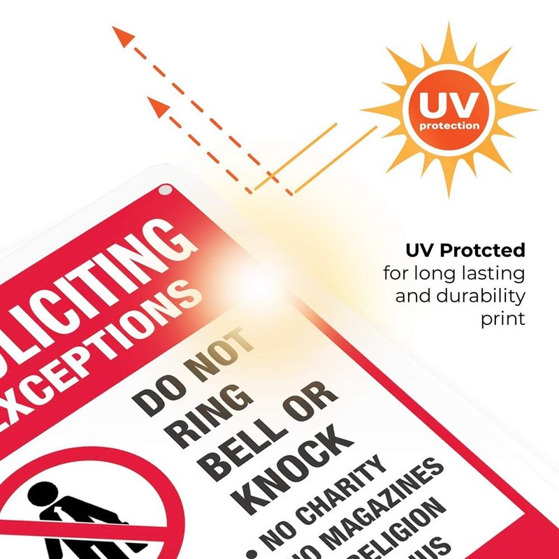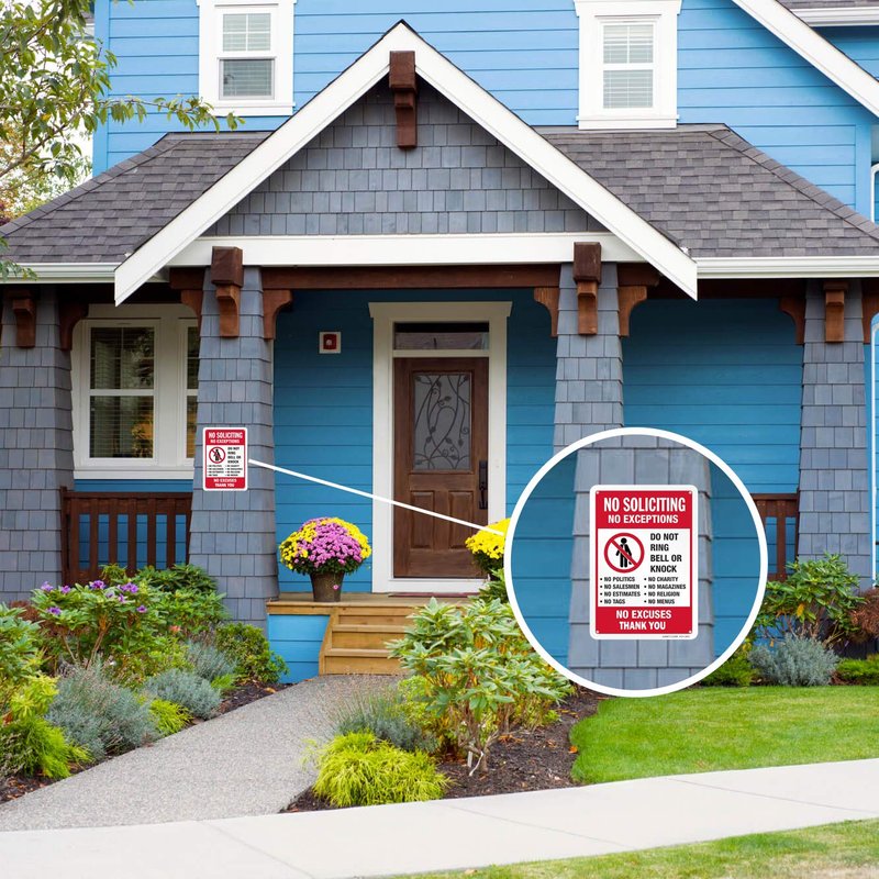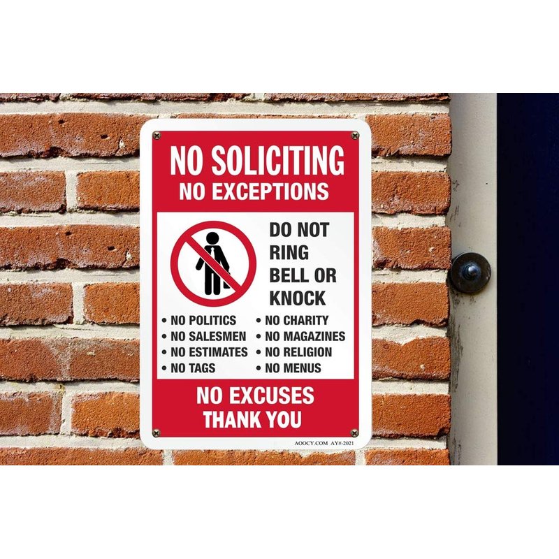 No Soliciting Sign For Home Tired of unwanted solicitations from salesmen or political and religious promoters? Do you want to sit at home or in your office in peace without people constantly knocking on your door or ringing your bell? You can now avoid these awkward interactions with our heavy-duty no soliciting sign for your home and business. Leave them with no excuses: Our signs ensure that any potential solicitors clearly understand the situation they are walking into. Leave them with No Excuses & No Exceptions so you can go on enjoying your day! Quickly buy this sign and hang it up before you get another knock on your door!