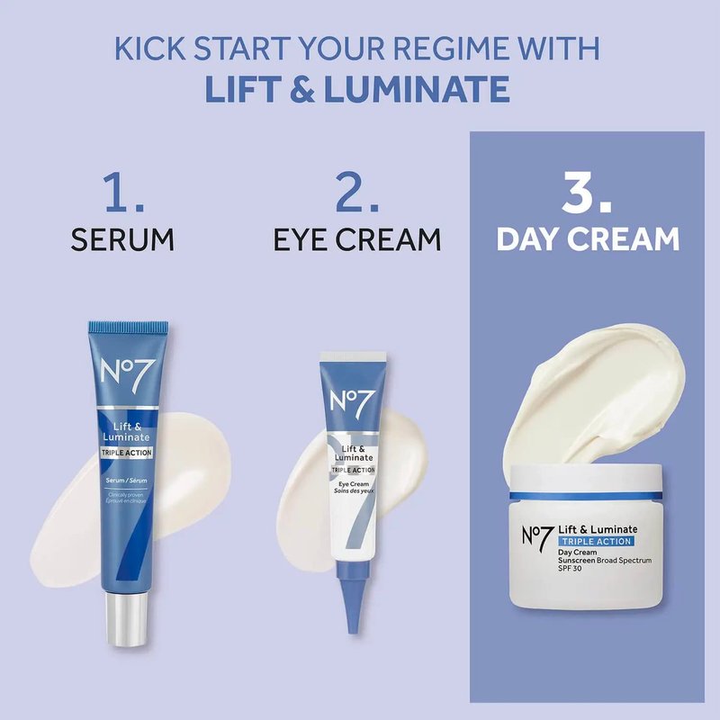 No7 Lift & Luminate Triple Action Day Cream SPF 30 - Broad Spectrum Anti Aging Face Cream - Hydrating Hibiscus Peptides & Hyaluronic Acid + Brightening Emblica & Vitamin C (50ml)