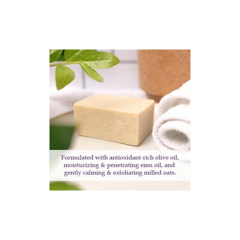 - Formulated with natural ingredients—olive oil, moisturizing and penetrating emu oil, and gently calming and exfoliating milled oats