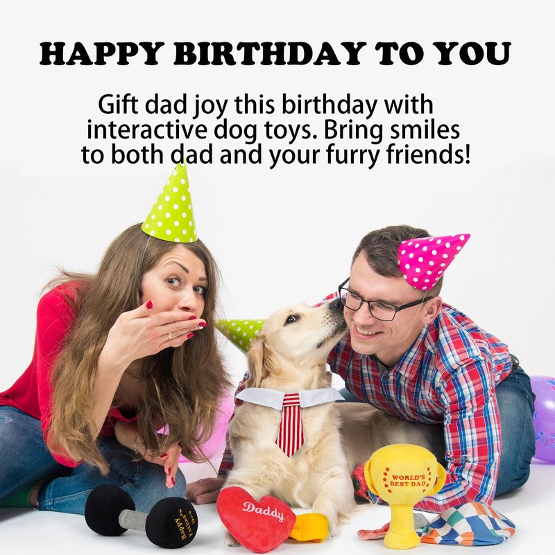 - Intimate interaction: There are giggling sounds inside the dumbbells and trophies, which will make giggly sounds when played, Just like the toy's slogan, telling dad that he is unique. As dogs nibble squeaky hearts, it's as if they're saying, "My daddy is awesome." Say goodbye to worries about how to celebrate birthday with your beloved pet—this plush toy set is the ultimate present for creating precious memories together!