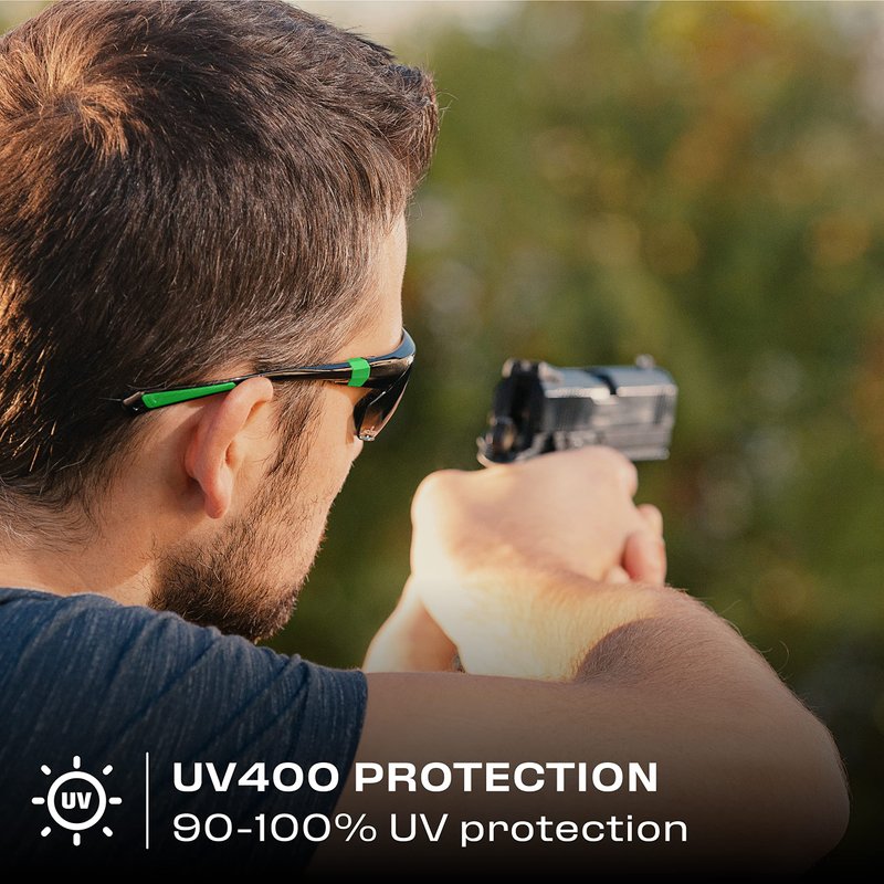 - 100% UV PROTECTION. Thanks to the green tinted lenses, these dark safety glasses block 85% of light. This decreases visual fatigue, and provides glare protection. They block harmful UV light too.