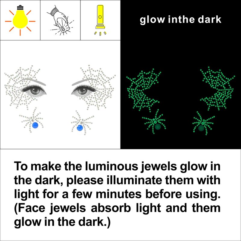 - EASY TO APPLY: All face gems are applied just like a sticker and can be used a few times, once the glue has dried out they can be re-used using eyelash glue. Please remember to apply these to a clean, dry face. If you have oily skin or sweat heavily, I recommend spirit gum to adhere to these body jewels more firmly. Please illuminate luminous face tattoo crystals sticker with light before using them. This operation will make the body jewelry look more clearer.