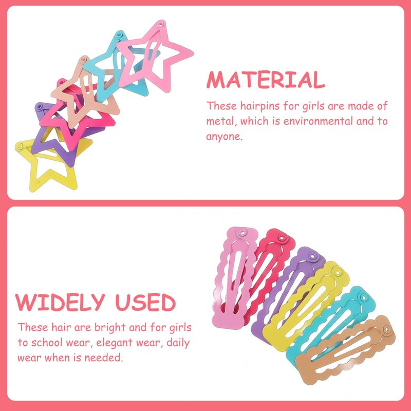 - Material: The hair clips are made of metal, sturdy and durable, not easy to fade or fall off, difficult to slip from the hair. with safe and candy color paint, resisting daily wear and drops.