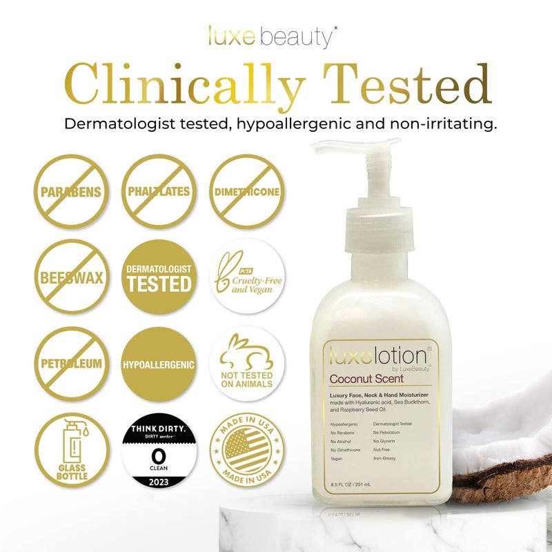 - NON GREASY MOISTURIZER - Let your skin breathe while nourishing and moisturizing with Luxe Beauty. Our lightweight, dimethicone-free, hyaluronic acid body lotion delivers powerful ingredients without a greasy, heavy, sticky, or oily feeling.
