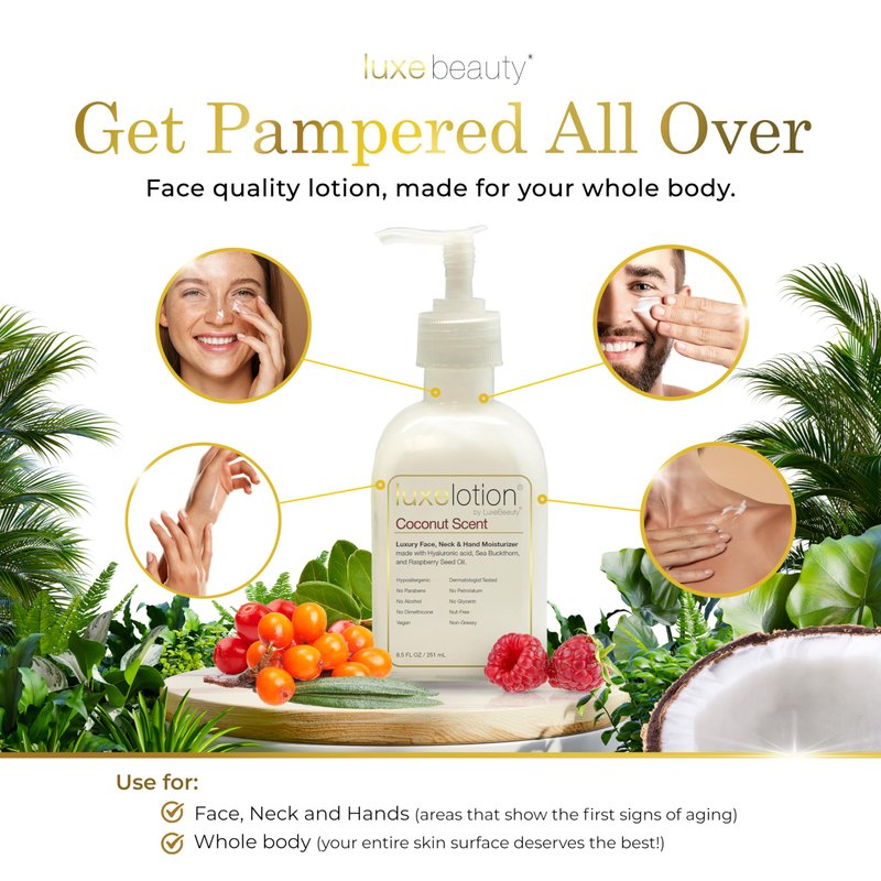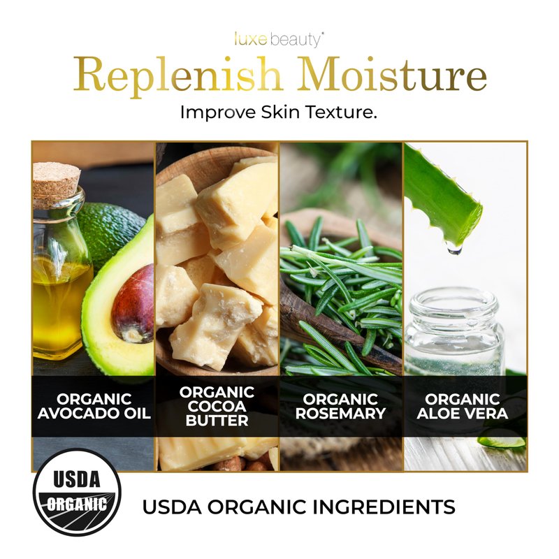 - ORGANIC INGREDIENTS - Luxe Beauty is vegan with USDA organic ingredients that benefit all skin types - dry, oily, or combination. Formulated with rich ingredients; hyaluronic acid for body, raspberry seed oil, sea buckthorn, and vitamin B3.