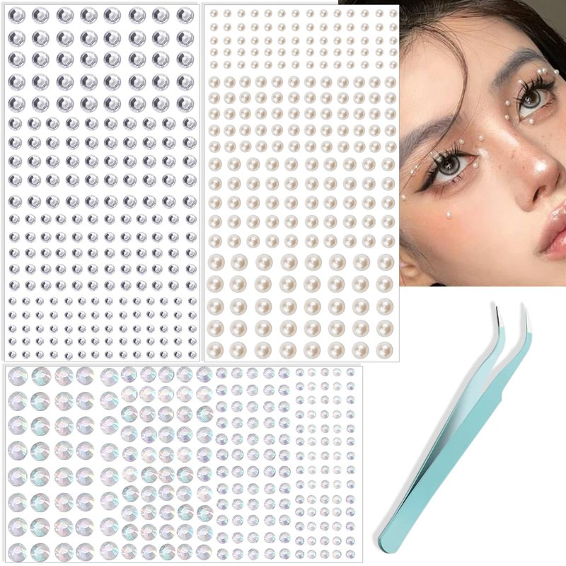 - 💎【Package Included】: Face jewels for makeup- 3 sheet, a total of 660pcs PEAL face rhinestones with 4 sizes(3/4/5/6mm);And a mint green tweezers.