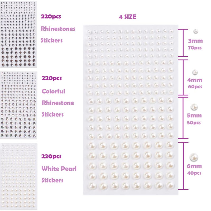 You have four sizes of diamond/pearl stickers, a total of 660 pieces. The quantity and size are abundant enough for makeup, nail art and crafting.