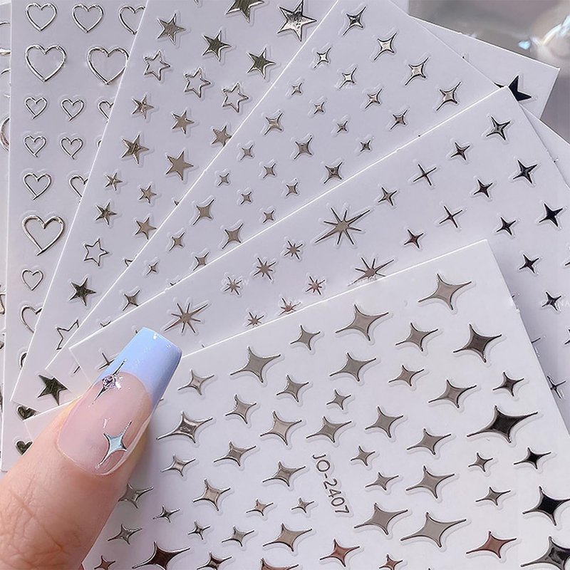 - 🌟Metallic Silver Nail Stickers Nail Accessories: The mirror metallic silver star nail stickers are made of high-quality materials, look shiny and textured, have their own stickiness, are easy to paste, durable, and can be used to decorate various nails.