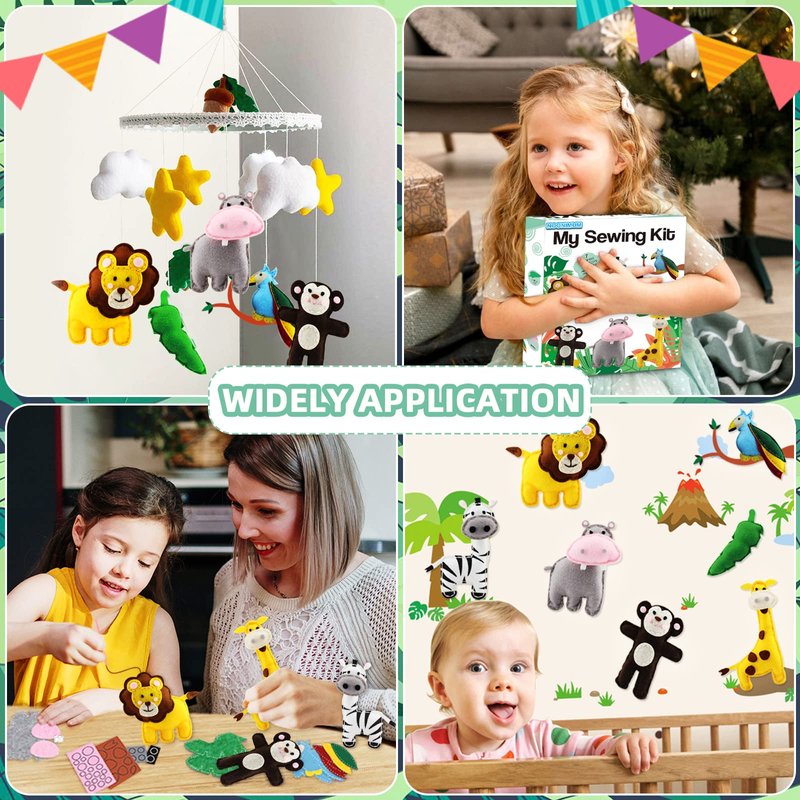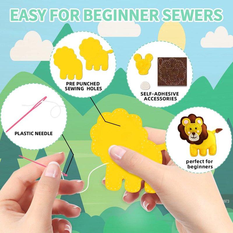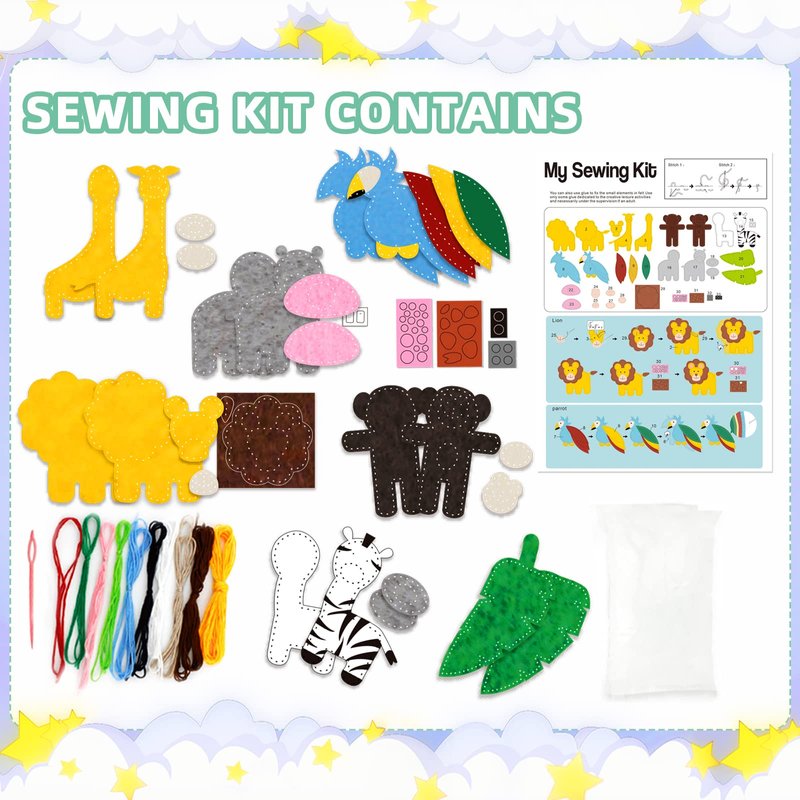 - 【Felt animals】This kids' sewing kit contains 7 felt shapes for lion, monkey, zebra, hippo, giraffe, parrot and leaf, 10 different colors of cotton thread, 32 felt accessories, 1 plastic sewing needle, 1 bag of cotton filler, and 1 instruction manual. You can make 7 kinds of cute felt animals.