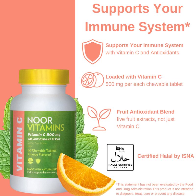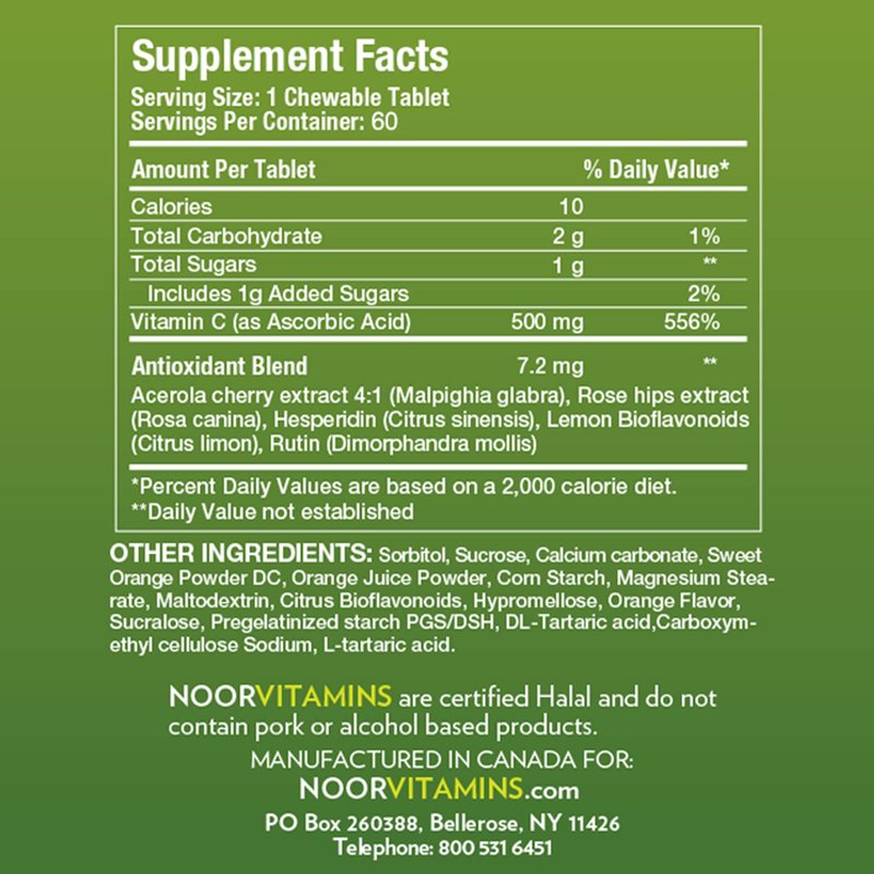 Noor Vitamins 500 MG Halal Vitamin C Chewable Tablets + Rose HIPS and Antioxidants I Supports Immune System I Vegan, Gluten Free & Halal Vitamin 60 Orange Flavored Chewable Tablets I 2 Month Supply