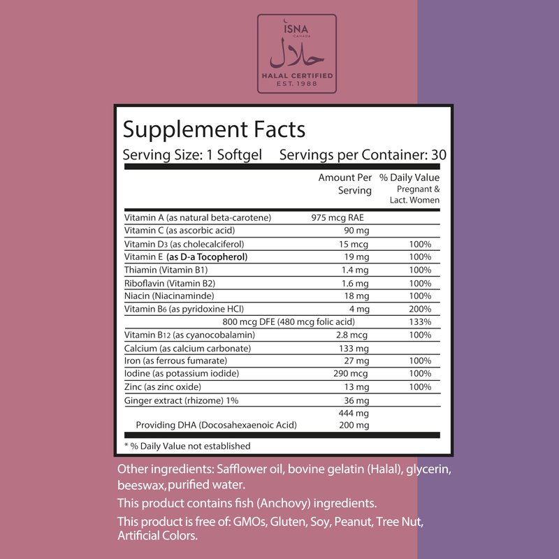 - Halal prenatal vitamins with DHA and Folic Acid (folate), formulated to support developing baby's brain and entire body.