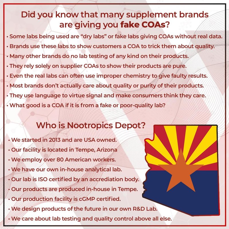 - LAB TESTED AND VERIFIED - All Nootropics Depot products are thoroughly lab tested to ensure our customers are receiving only the highest quality ingredients at the optimal strength, potency and purity.