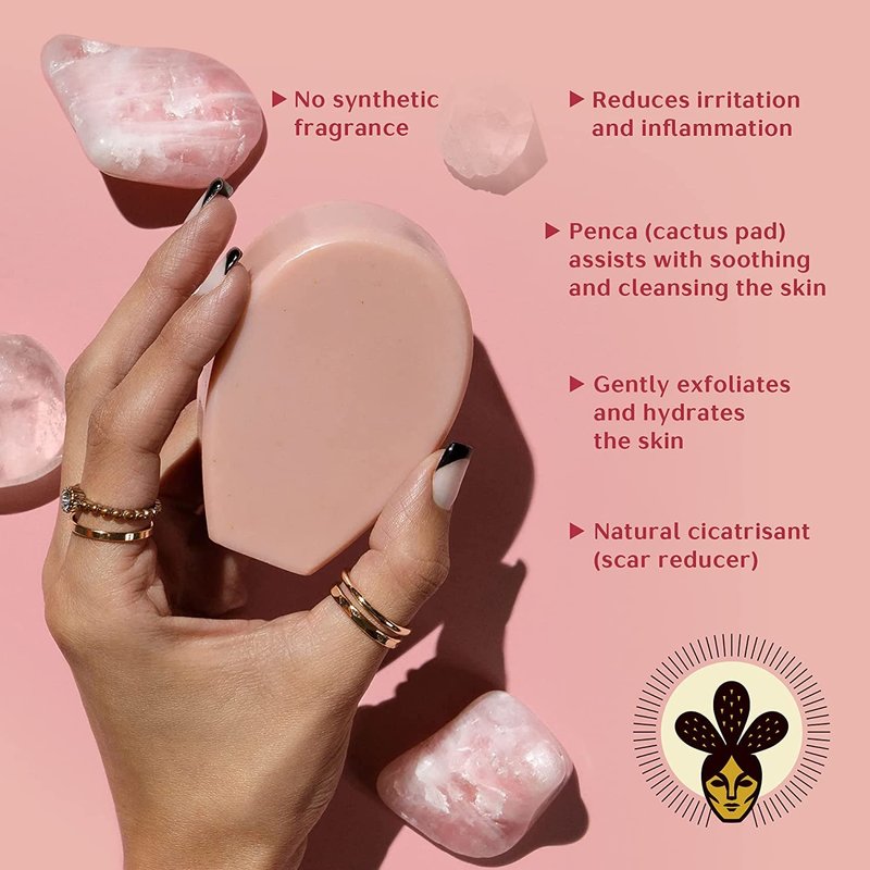 - Cleansing & Moisturizing Soap – Featuring a dual-action formula that cleanses your skin without drying it out, this artisan soap contains jasmine oil for a mood-enhancing, delicate scent. Prickly pear cactus maintains your skin’s natural moisture balance, while pink rose clay exfoliates