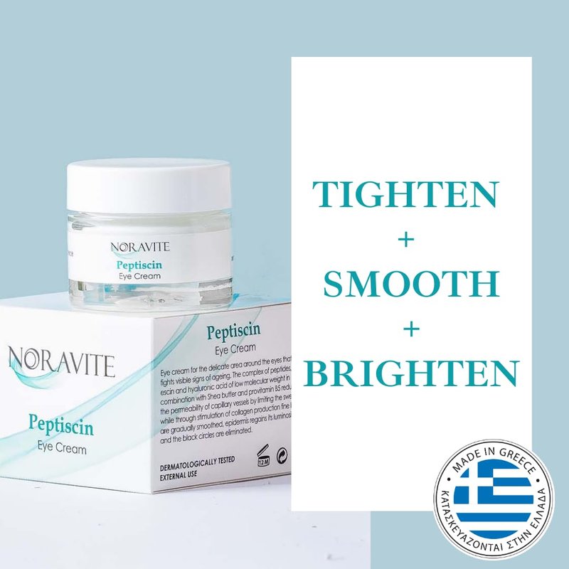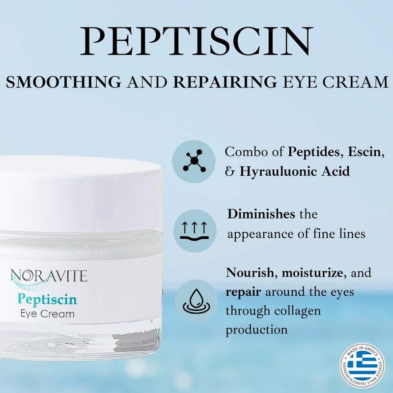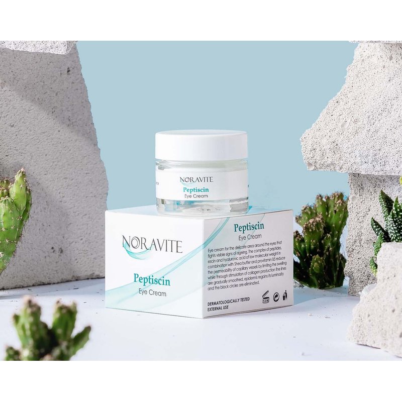 - Eliminate the appearance of fine lines, under eye puffiness and dark circles with Noravite PeptiScin eye cream. This natural eye cream helps restore moisture to your delicate eye area using a unique combination of peptides, escin, hyaluronic acid, shea butter and provitamin B5. PeptiScin stimulates skin repair reducing the appearance of crow’s feet, dark circles and puffiness around the eyes. This eye cream is safe for all skin types. The hydrating formula gently absorbs and can be worn under