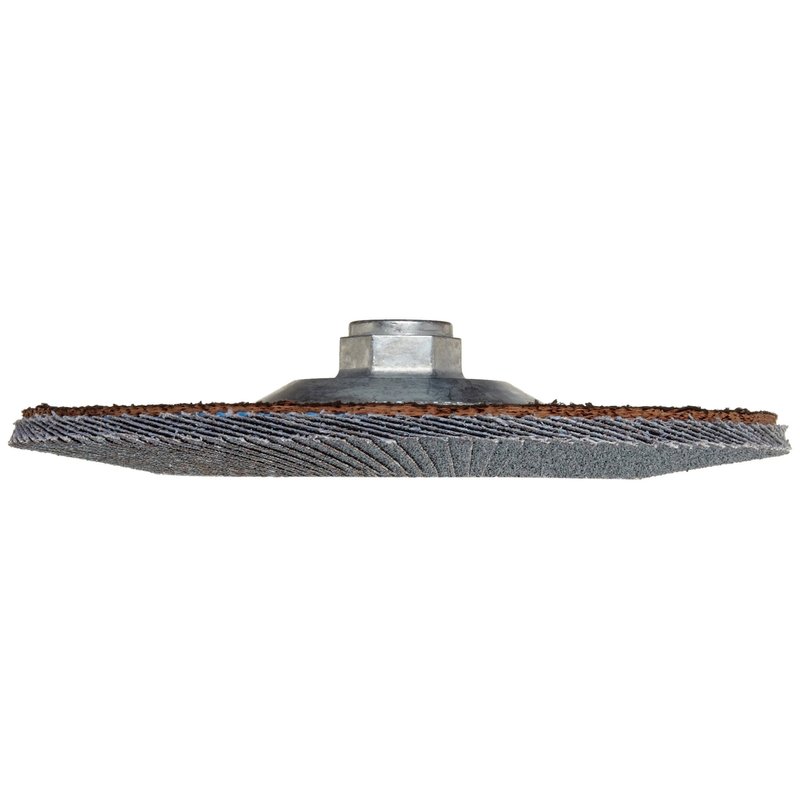 - Flap disc works with a right-angle grinder and is angled to ensure maximum contact with the workpiece