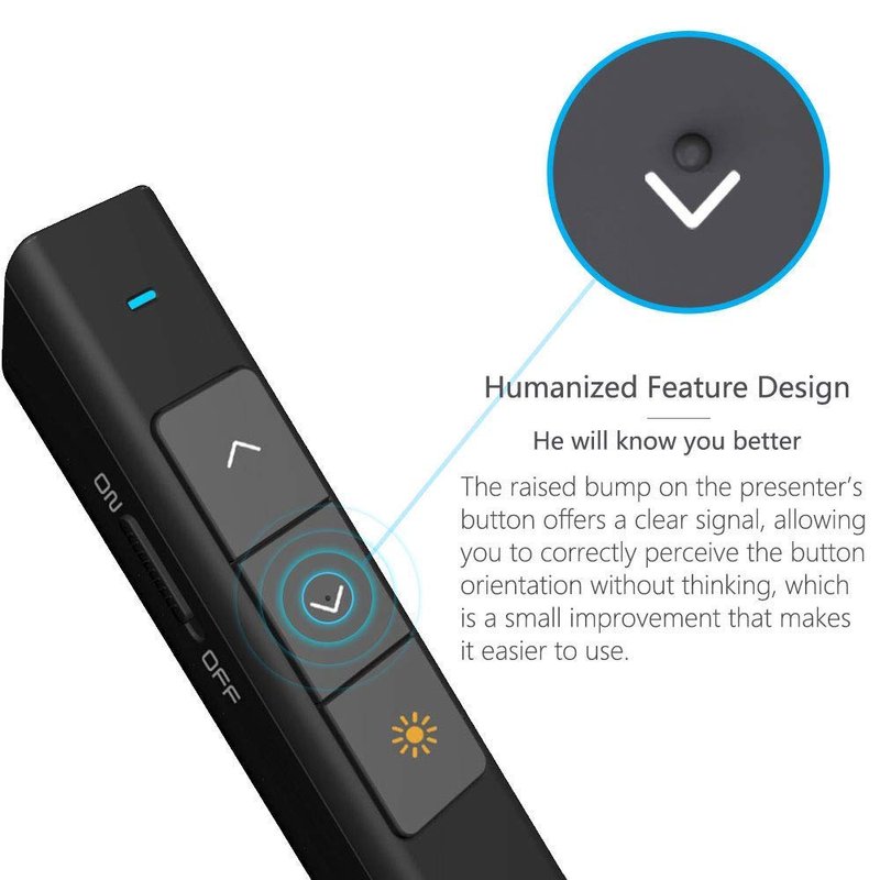 - Easy to Carry:Presentation clicker is only about 20g, no burden to carry, the click buttons are made of silicone with concave design, no need to look down to distinguish the position of the buttons, so you can focus more on the presentation. One-piece magnetic usb storage, no more worry about losing it.