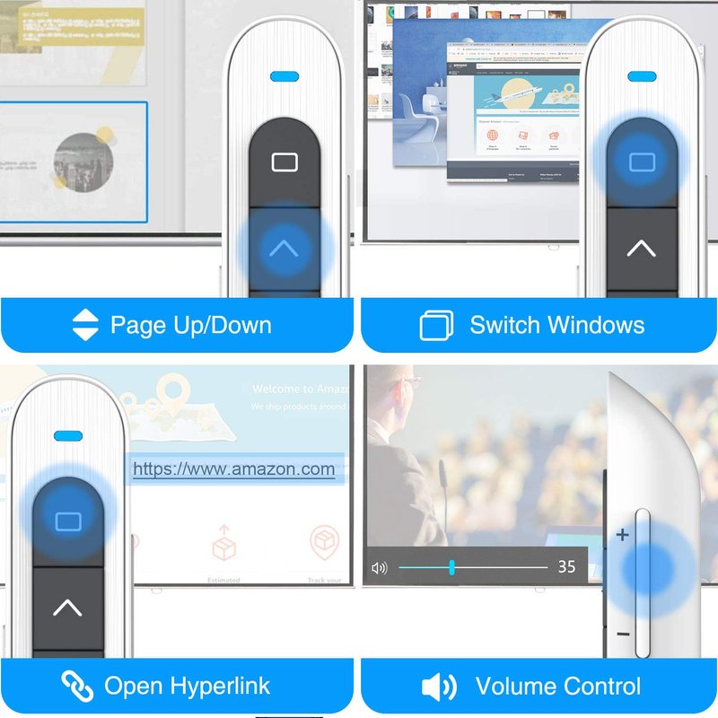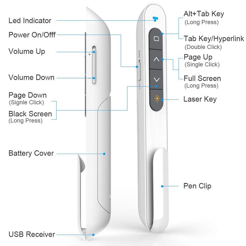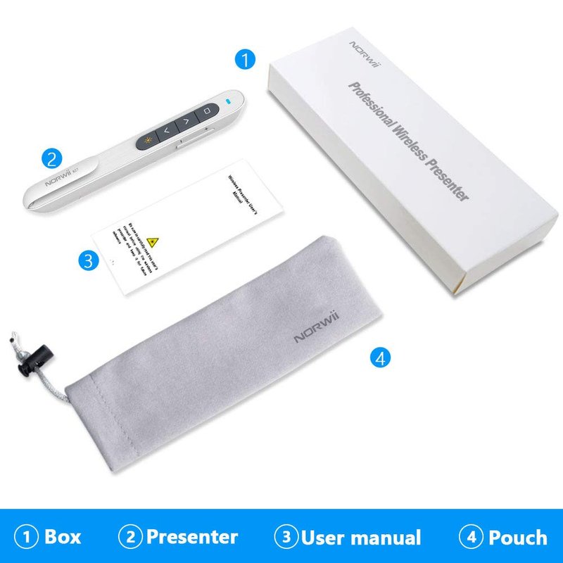 - Plug & Play - Presentation pointer supports HYPERLINK, Volume Control, Switch Windows, Full/Black Screen, Page Up/Down. Besides, NORWII pointer presenter supports key-customized function, each key can be customized hotkeys, such as Media Play/Pause, Previous/Next Track, Volume Mute, etc. Presenter clicker is easy to use, only Plug and Play.