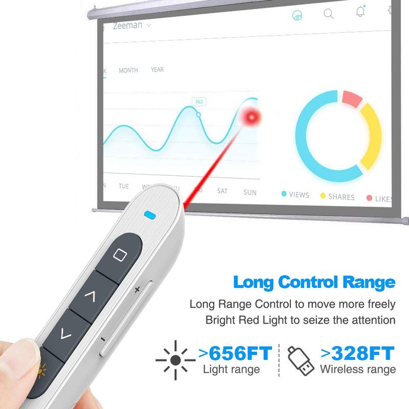 - Long Control Range & Professional - PPT clicker is equipped with top-grade microchip to ensure a real 100M/330FT control distance, Light Range: 200M/660FT. Powerpoint remote produces a bright red light that's easy to see against most background(Not Recommended for led/lcd/tv screens)