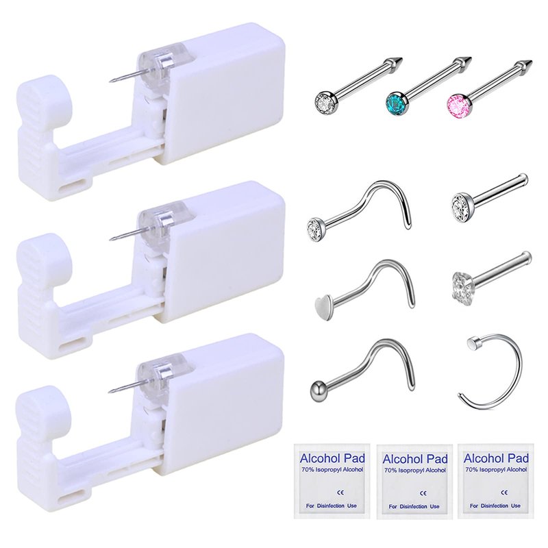 3 pieces of nose studs (white, pink,blue color, Built-in the nose pierce gun)