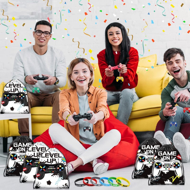Features: Create party atmosphere: These video gamer party supplies can be lovely decorations for your video game themed parties, and your guests can wear the bracelets, and use the keychain to decorate their bags, creating a vigorous party atmosphere. Nice color combination: These video game candy bags, keychains and wristbands are designed in various colors and patterns, which can add variety to your party, allow you and the guests to choose according to their preference. Specifications: Color: as shown in the picture Size: Drawstring bag: about 12 x 10 inches Bracelet: about 2.5 inches in diameter Package includes: 24 x Drawstring bags 24 x Silicone bracelets 24 x Controller keychains Notes: Manual measurement, please allow slight errors on size. The color may exist a slight difference due to different screen displays. The words on the products do not worked as trademark use, our trademark is Nosiny, kindly noted. Suitable for people over 6 years old. Adults' supervision is required.