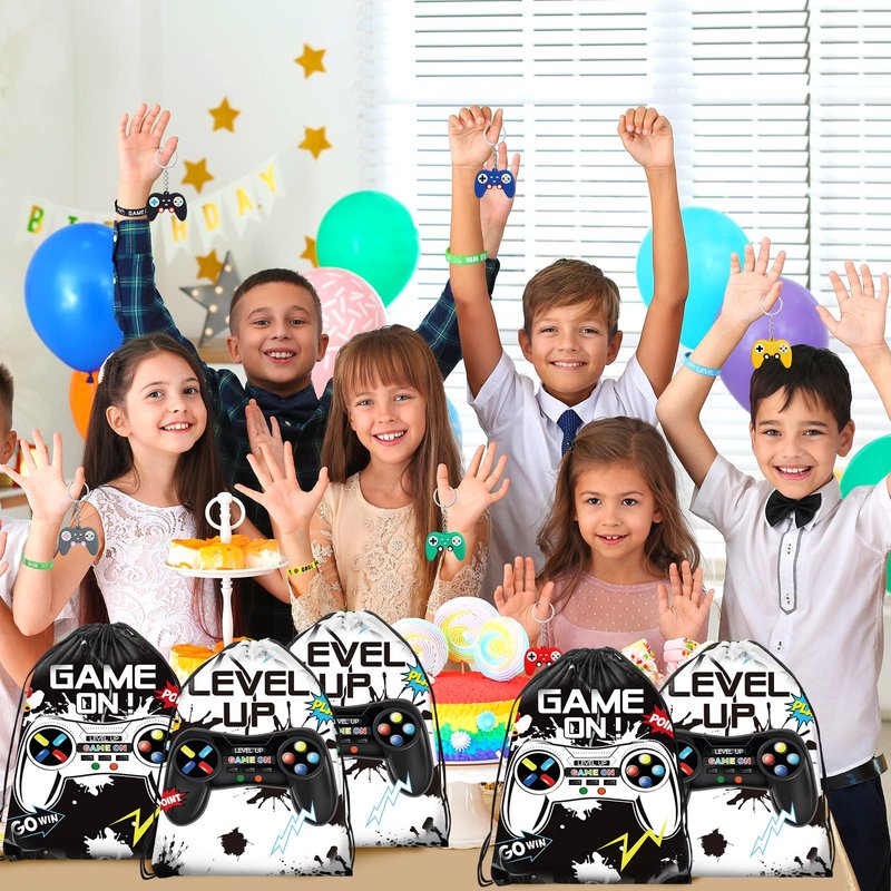 Nosiny 72PCS Video Game Party Favors Birthday Include 24 Video Game Goodie Drawstring Bags 24 Silicone Bracelet 24 Controller Keychain for Kids for Party Supplies (Black, White, Cute)