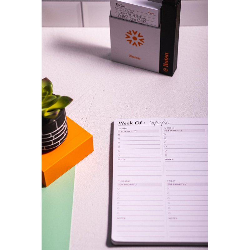 Whether you're a project manager, a business owner, a college student, or a parent, Notsu is creating modern, minimalist products to help you plan and organize. More flexible than a monthly calendar, our tear-off weekly planning sheets help you visualize and schedule the most important tasks of your week.