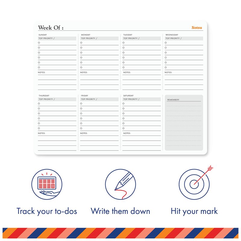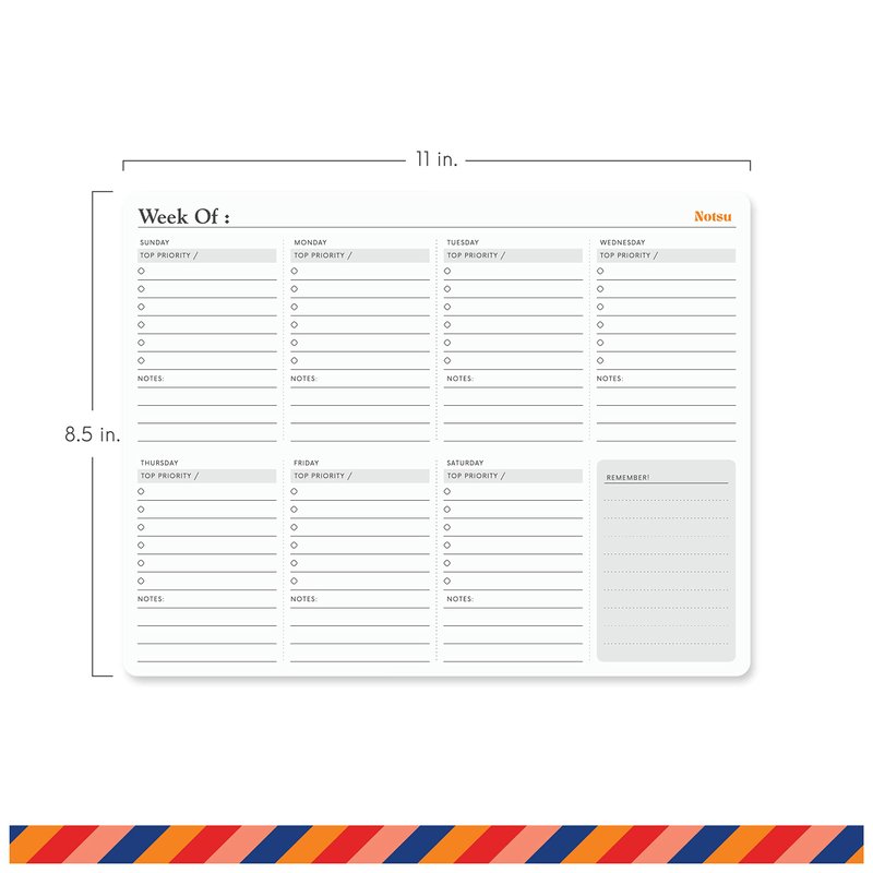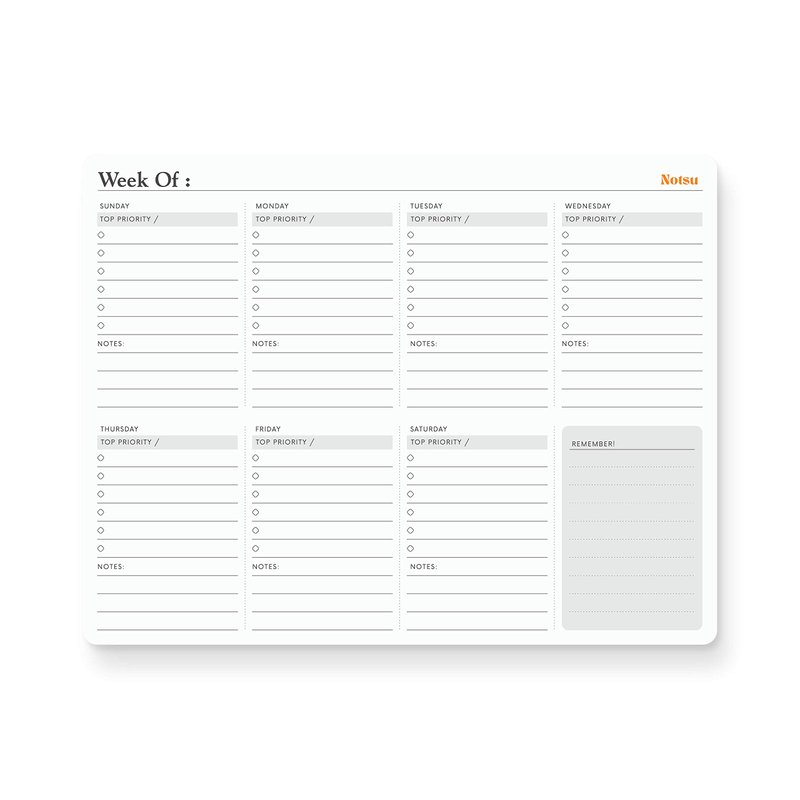 - ELEGANT DESIGN | The modern, clean lines of Notsu's Weekly Planning Pad go well with modern office décor and fit your style. Tiny touches such as the rounded corners and easy-tear binding demonstrate the Notsu design philosophy.