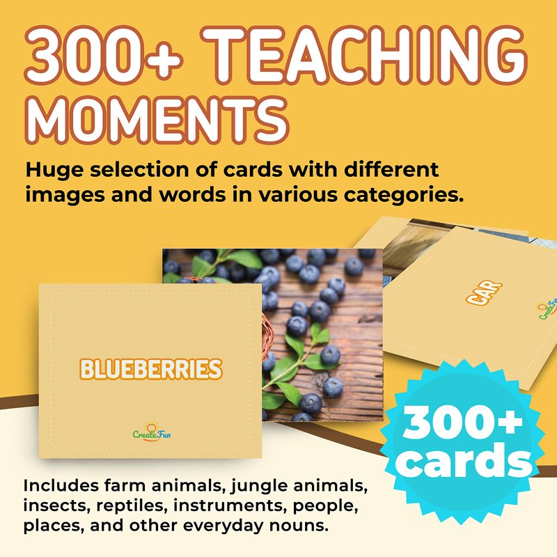 CreateFun Noun Flash Cards Volume 1 - Creative and Engaging Cards for Learning for Children and Adults Vocabulary flash cards are an effective tool for teaching concepts to children no matter what their situation is. It helps improve cognitive brain functions important for everyday learning. Toddler flash cards help improve critical thinking skills, vocabulary, reasoning, and communication. There are many early learning flash cards available on the market but most of them are low-quality and have dull colors.