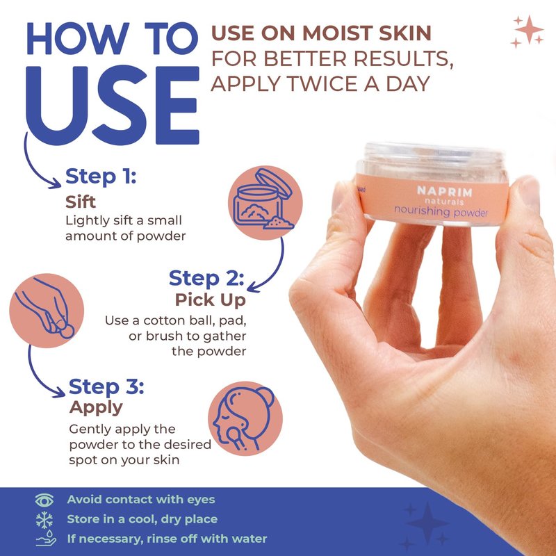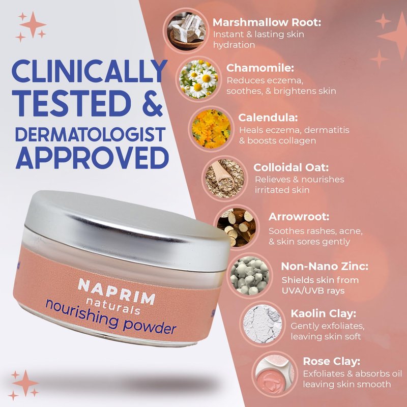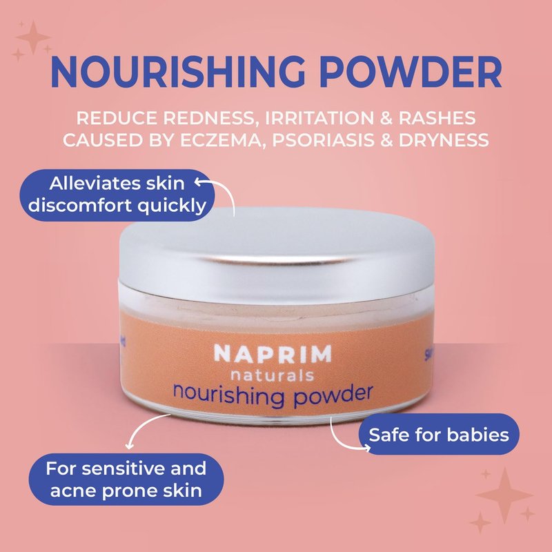 NAPRIM Naturals - Nourishing Powder - 20gCalm irritated skin and clear breakouts and blemishes, naturally! Made to soothe your face and body, NAPRIM Naturals talc-free Nourishing Powder helps to reduce dryness, redness, and irritation caused by eczema, psoriasis, and dryness. This calming skin powder is formulated with soothing natural ingredients, making this the perfect skincare solution for everyone, including those with sensitive skin or prone to breakouts.Extra Sun ProtectionProtect your face and body from excess UV damage. Our Nourishing Powder contains non-nano zinc oxide to provide a natural layer of protection against harmful UVA and UVB rays.Naturally UnscentedOther facial and body powders are heavily scented and can be harsh on sensitive skin. NAPRIM Naturals Nourishing Powder is naturally unscented, free from fragrances and perfumes.Experience naturally better skincare with NAPRIM Naturals!Nourishing PowderVeganAll-Natural IngredientsTalcum FreeNaturally UnscentedFor Face & BodyCalms InflamationSoothes Skin Irritation, Redness, and DrynessClears Breakouts and BlemishesFaux-Hair Kabuki Brush For Easy Application IncludedLoose Powder Container (20g)Proudly Made in the USANAPRIM NaturalsWe believe that hair and skincare products should be safe and sustainable. At NAPRIM Naturals, we dedicated our mission to creating premium, plant-based powders suitable for all skin types. Our products are always vegan, free of talc, and unscented to nourish your hair, face, and body.