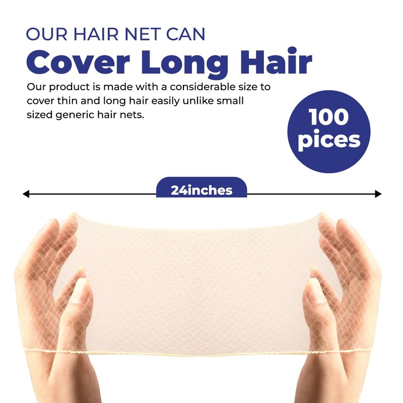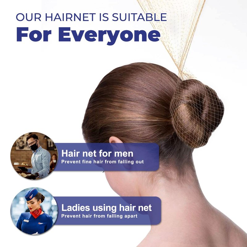 Our gold hair nets are indispensable for maintaining hygiene and a polished look, whether you're a chef, food service worker, or performer. They ensure your hair stays perfectly in place, making them essential in any professional setting. These nets help you comply with health and safety regulations, providing a clean and tidy appearance. Designed with comfort in mind, these hair nets are made from lightweight, breathable fabric. You'll barely notice you're wearing one, even during long shifts or performances. The mesh design ensures excellent ventilation, keeping you cool and comfortable. Versatility is unmatched with our hair nets. They are perfect for a wide range of uses, from mastering culinary skills to shining in a dance competition. These nets promise to keep your hair secure and tidy, ensuring a polished look for any activity.Reliability is a key feature of our hair nets. Made from highly elastic nylon lace, they are robust and can withstand up to 33 pounds of pull. This durability ensures your hair remains securely in place without compromising on comfort.The universal fit design allows our hair nets to stretch and accommodate almost any head size and hair type. Whether you have long, short, thick, or thin hair, these nets provide a snug and secure fit for both professional and personal use.Neatly packaged and easy to store, you'll always have a hair net on hand when you need it. Customer Satisfaction Guaranteed:We are dedicated to providing high-quality products. If you have any questions or concerns, our customer service team is ready to assist you, ensuring your complete satisfaction with our hair nets. Choose our 100-pack of black invisible hair nets for a reliable, comfortable, and professional solution to keeping your hair neatly secured. Whether in the kitchen, on stage, or elsewhere, these hair nets are designed to meet the demands of your busy lifestyle.