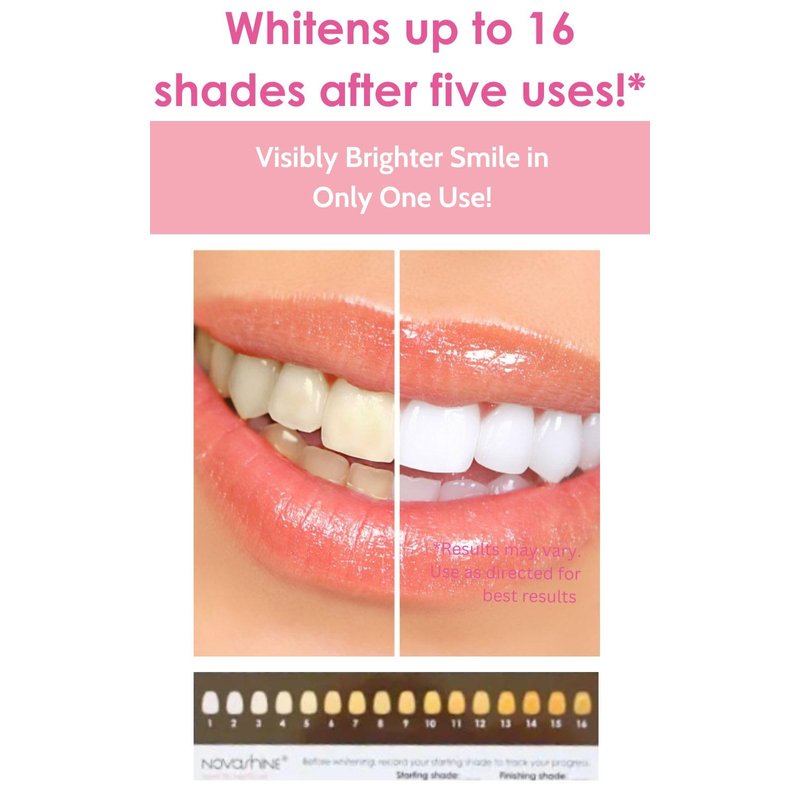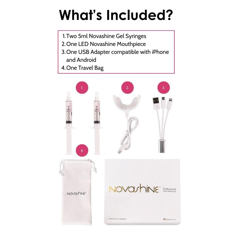Novashine Teeth Whitening Kit comes with everything you need to restore your natural bright smile at the comfort of your own home. Achieve in-office results at home with this advanced whitening kit.
