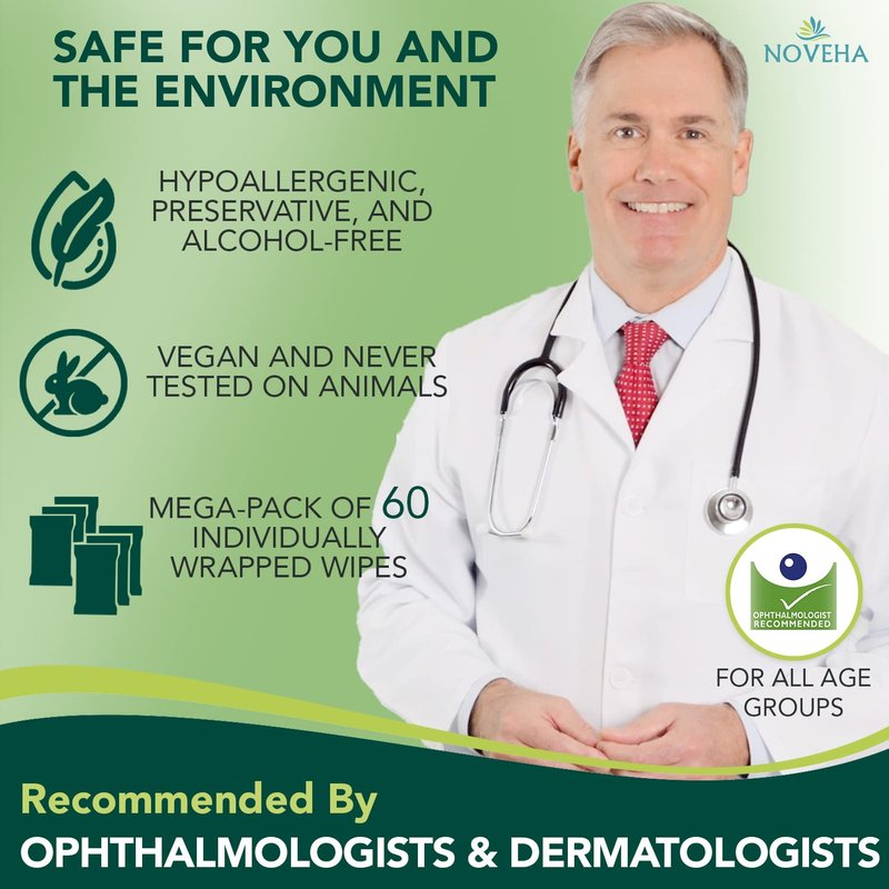 - RECOMMENDED BY DOCTORS AND OPHTHALMOLOGISTS: Our eyelid wipes undergo meticulous inspection for safety and quality, are recommended by doctors, and are safe to use for all ages. It’s time to start treating your eyes like they really deserve. Click ‘Add to cart’ and order your very own NOVEHA daily hypoallergenic eye wipes TODAY!