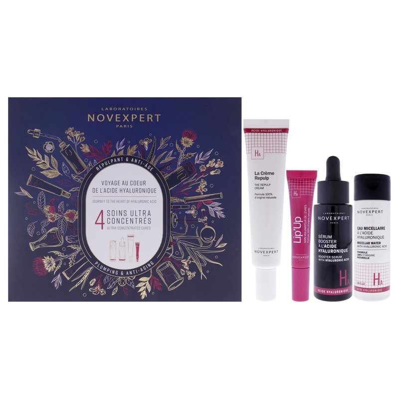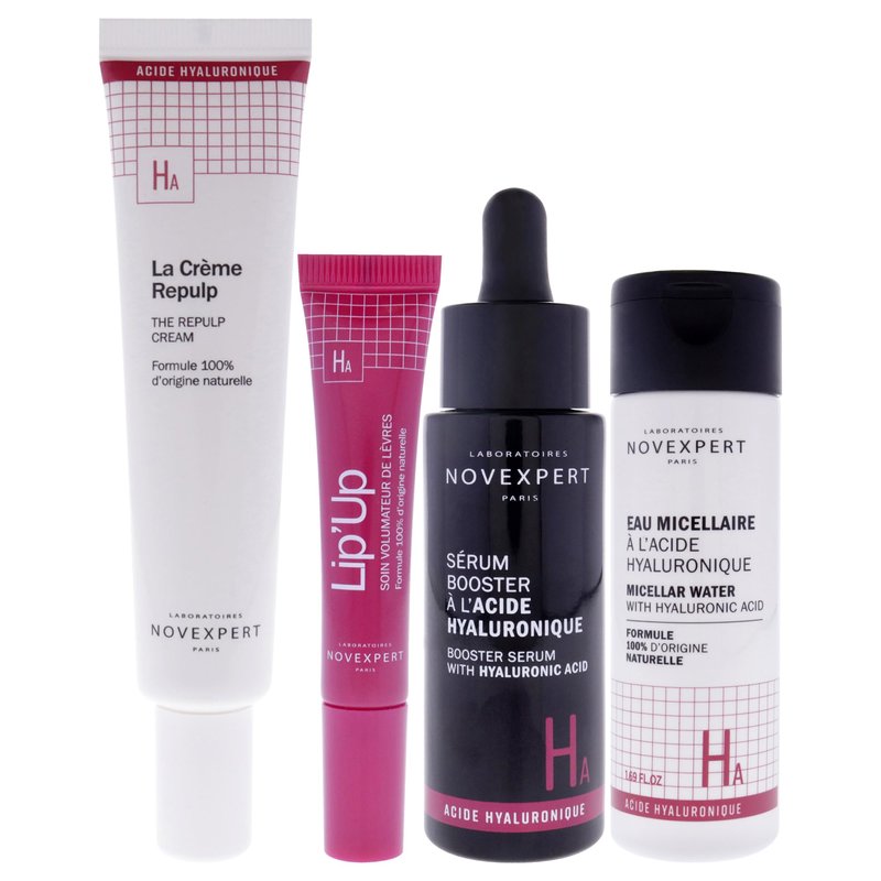 Novexpert Plumping and Anti-Aging Set for Women - 4 Pc 1.6oz Micellar Water with Hyaluronic, 1oz Hyaluronic Acid Booster Serum, 1.35oz The Repulp Cream, 0.27oz Plumping Lip Care