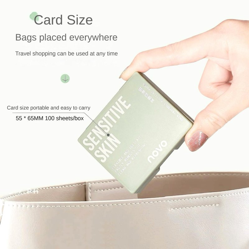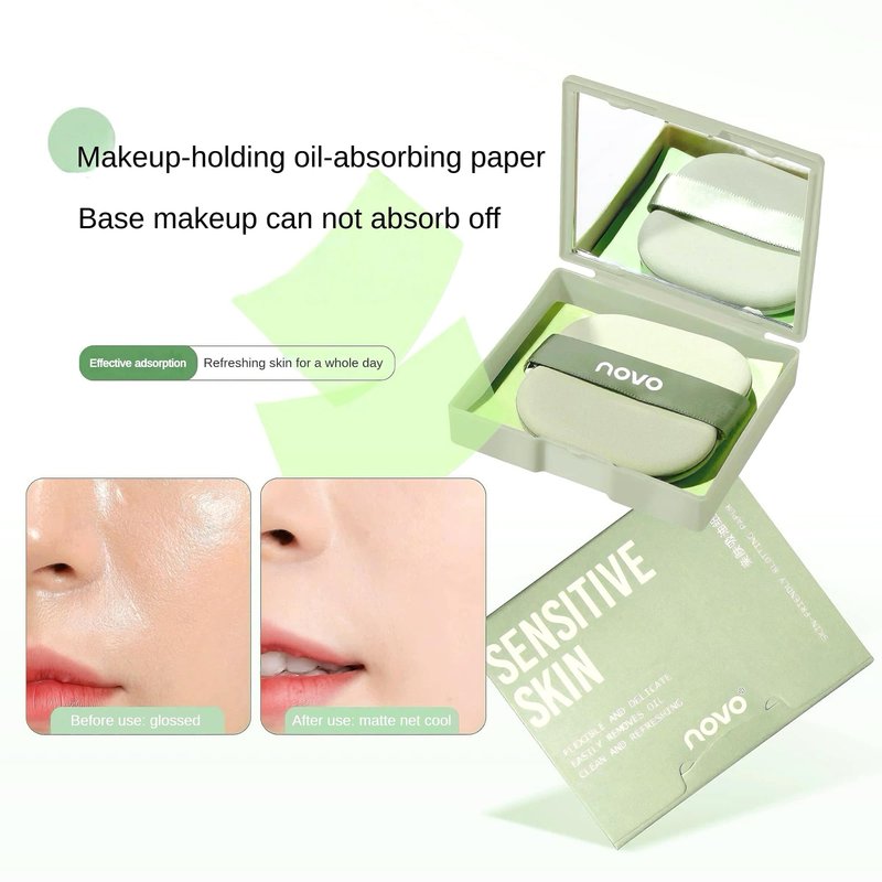 Novo Oil Absorbing Sheets are the perfect solution for oily skin, combining the functions of blotting paper, a powder puff, and a built-in mirror in one innovative design, making oil control simple and effective. Each pack contains 100 high-quality oil blotting sheets paired with a sticky powder puff. Simply press the puff gently against your face to instantly absorb excess oil, leaving your skin feeling fresh and shine-free. The powder puff applies even pressure, ensuring a smooth and consistent oil absorption without the unevenness that traditional blotting papers can sometimes cause. The built-in mirror allows for quick makeup checks, ensuring that your face stays oil-free and your makeup remains intact. The compact, card-sized case is convenient for carrying and easy to store, making it ideal for travel or daily use. Whether you're on the go during busy workdays or on a business trip, this oil blotting paper helps you achieve fast and effective oil control, keeping your skin fresh throughout the day. Perfect for those who need quick touch-ups during long days out or frequent makeup applications. As oily skin can often lead to shine issues, Novo Oil Absorbing Sheets provide a simple and convenient solution, helping you maintain a shine-free and natural look at all times.