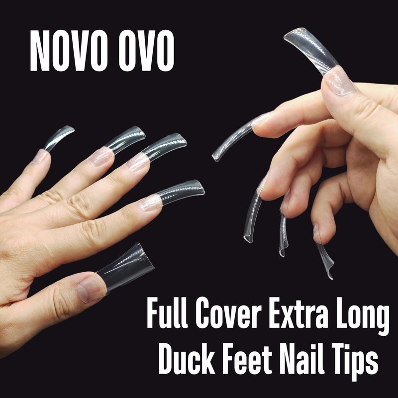 NOVO OVO 120 pcs Extra Long Duck Nail Tips Full Cover for Acrylic, Clear XL XXL Flare Feet Nails Press On, Y2K Vibe Wide French Soft Gel False Nail Extension for Art Salon x 12 Sizes in Box