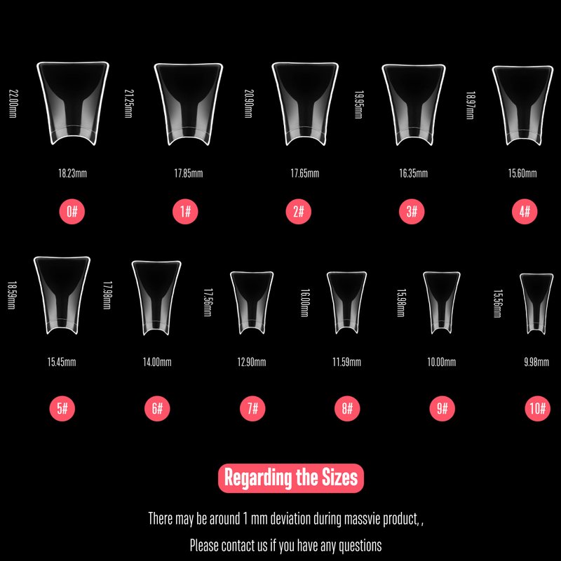 Duck Flare Nail Tips Each Product including Total: 550 Wide Duck Feet Nail Tips Size: 11 Sizes, 50 Tips Per Size Way of Using: Professional Salon or DIY