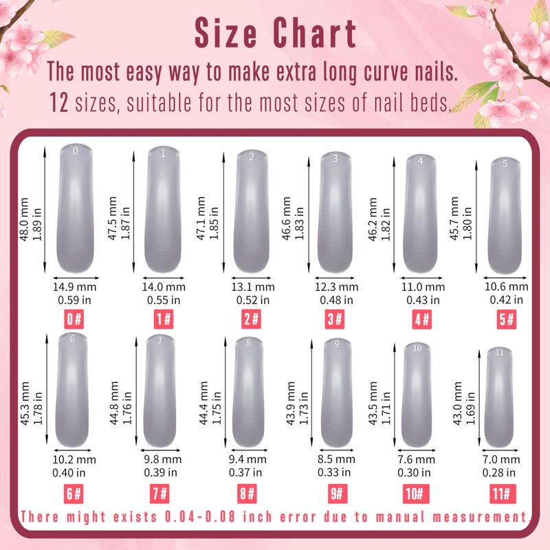 - 【Length and Shape】Despite being called XL or even XXL, our nail tips are designed with a length range from 1.89 inch to 1.69inch (from the largest tip to the smallest tip). You can easily cut and trim them to your desired length, whether it's XS, short, or medium, while still maintaining the natural curved shape. The top part of the nail tip is made sturdy, if you want to shape it into other styles like almond, oval, round, squoval, stiletto, or coffin, we recommend using a nail drill and cutter.